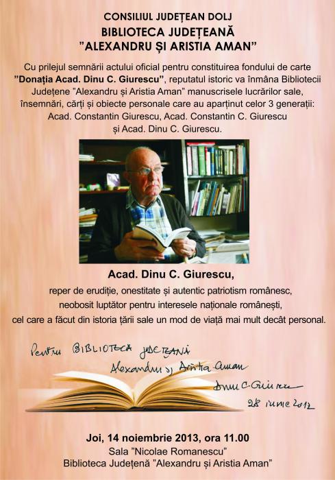 Ora 11.00 – Ceremonia de semnare a actului oficial pentru constituirea fondului de carte Donaţie Acad. Dinu C. Giurescu în cadrul Colecţiilor Bibliotecii Judeţene „Alexandru şi Aristia Aman”. (sala N. Romanescu, clădirea Aman, parter)