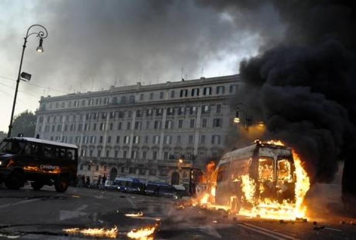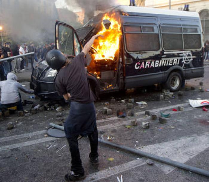 Fortele de ordine au lansat asaltul in fata basilicii San Giovanni in Laterano, cu gaze lacrimogene si tunuri de apa, in timp ce sute de persoane scapate de sub control, mascate cu fulare negre, lansau fumigene, cocteiluri molotov si sticle impotriva politistilor. Alte persoane au continuat sa incendieze masini si au patruns intr-o cladire oficiala din apropiere de Colosseum, unde au aruncat fumigene, in timp ce zeci de mii de persoane continuau sa manifesteze pasnic, in cadrul zilei mondiale impotriva precaritatii si finantelor.