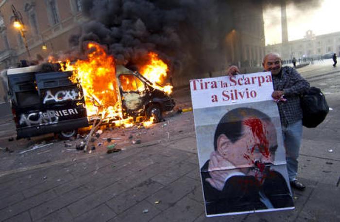 Principalele trei confederatii sindicale, precum si sindicatele studentilor, s-au alaturat acestui cortegiu inspirat de "indignatii" de pe Wall Street si cei din Spania. "O singura solutie, revolutie!", "Nu suntem bunuri in mainile bancherilor", se putea citi pe pancartele manifestantilor. Un grup purta un sicriu pe care era scris numele premierului Silvio Berlusconi. Centrul capitalei italiene a fost inconjurat inca din cursul diminetii de politie, care se temea de incidente violente pe fondul manifestatiilor, similare celor din decembrie 2010 care s-au soldat cu zeci de raniti.